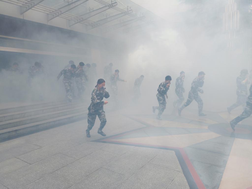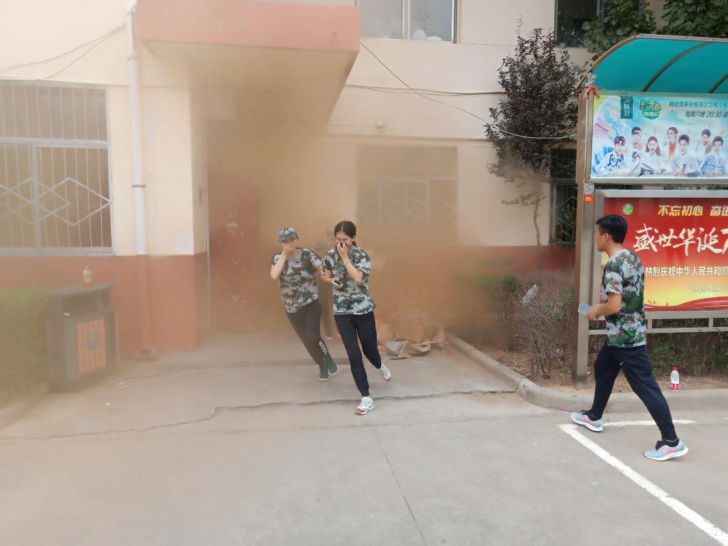 演练开始前,我部(处)多次与承训教官和有关部门沟通协调,制定了科学可行的活动方案,并在校本部和沣峪校区的教学楼内设置突发火灾的模拟场景,以达到良好演练效果。演练正式开始后,工作人员释放烟雾弹模拟火情,教学楼内外弥漫着烟雾,在承训教官的统一指挥协助下,学生按照逃生动作轻捂口鼻、弯腰躬身,按预定的疏散路线从教学楼迅速撤离,整个演练过程紧张但又有条不紊。