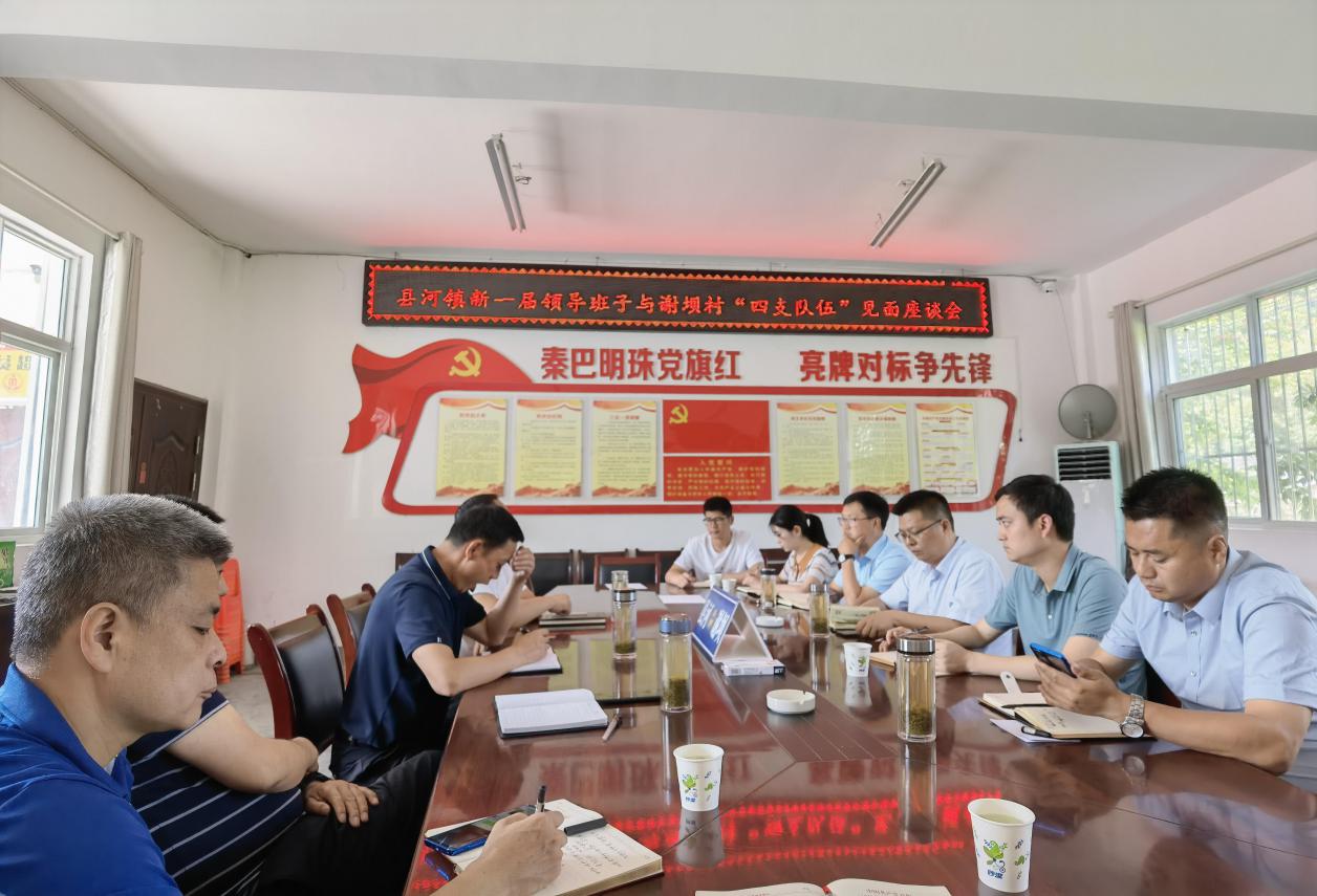 2021年6月8日,在谢坝村综合服务中心召开了县河镇新一届领导班子与谢坝村“四支队伍”见面座谈会。县河镇全体党委委员和谢坝村“四支队伍”的同志参加了会议。