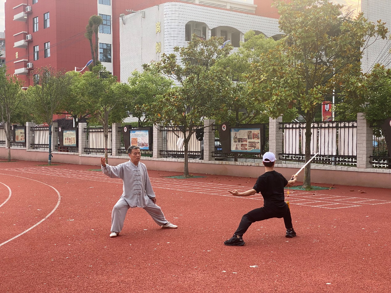 (图为武术学院2020级朱雨晗与张滩高级中学来校长进行太极交流)