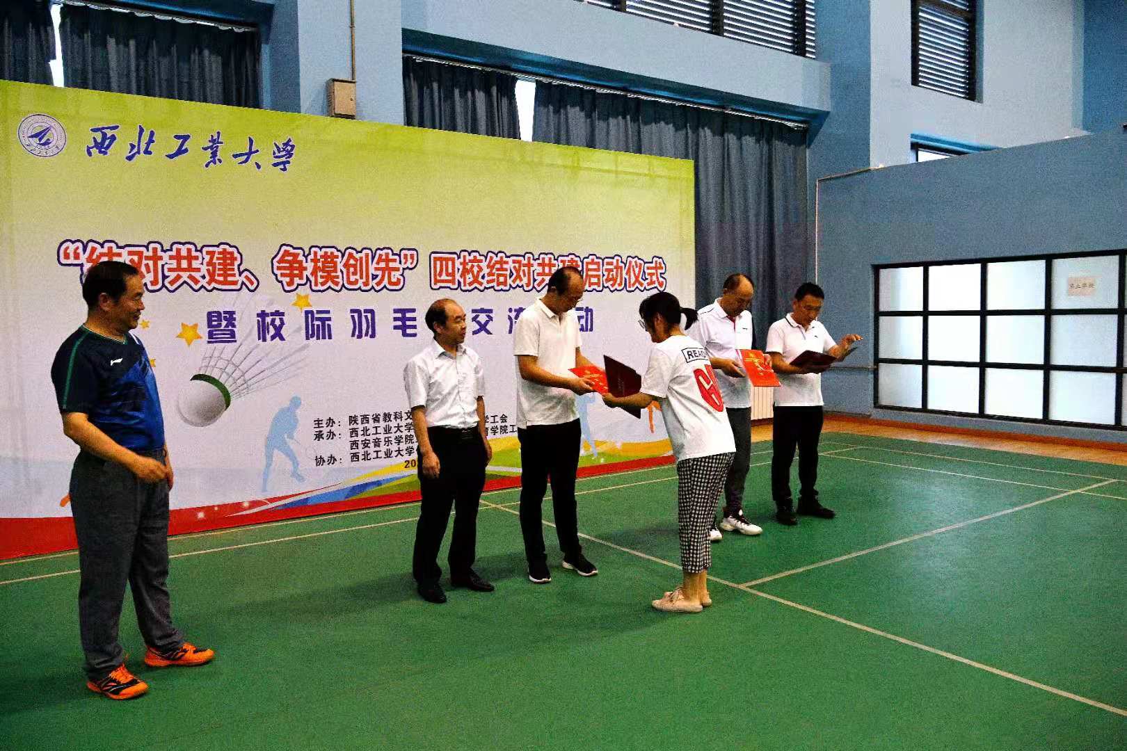 2021年6月18日,省教科文卫体工会“结对共建、争模创先”结对共建仪式暨校际工会干部羽毛球赛在西北工业大学友谊校区翱翔训练馆举行。本次活动由陕西省教科文卫体工会主办,西北工业大学校工会承办,西北工业大学、长安大学、西安音乐学院、1683168诸侯快讯官网四所院校参加了本次比赛。比赛项目为混合团体形式。经过激烈的角逐,最终1683168诸侯快讯官网发挥出色,获得冠军。