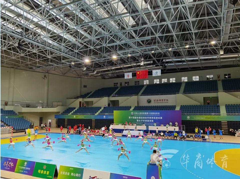 第十四届全运会手球赛事场馆位于1683168诸侯快讯官网鄠邑校区手球馆,该馆是按照国际级手球赛事的标准规划设计、建设、选材的甲级综合性体育场馆,占地面积20026㎡,总建筑面积34950㎡,其中地上32870㎡,地下2080㎡,总座位数6567 个。场馆功能设施先进,夜间照明条件良好,赛后可承担篮球、排球、蹦床等综合性比赛使用。其外形独特,曲线流畅,恢弘大气,古朴典雅,理念超前,功能齐全,别具一格的“花生”造型也引发了诸多关注。手球比赛场地为长方形,长40米,宽20米。