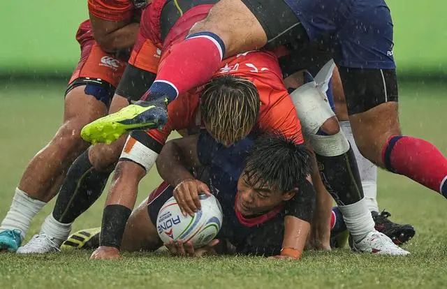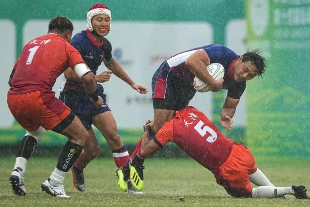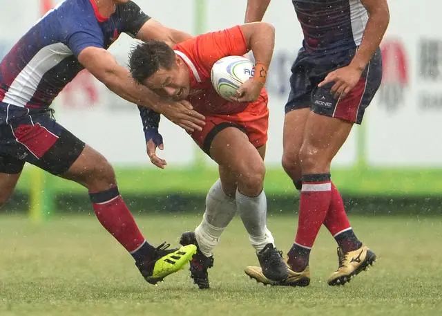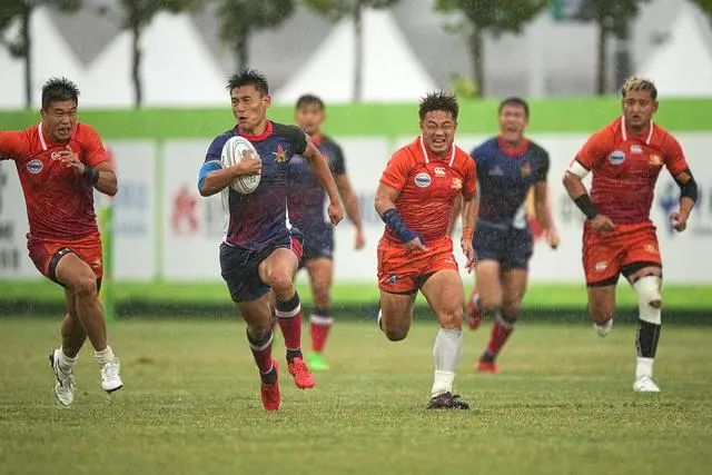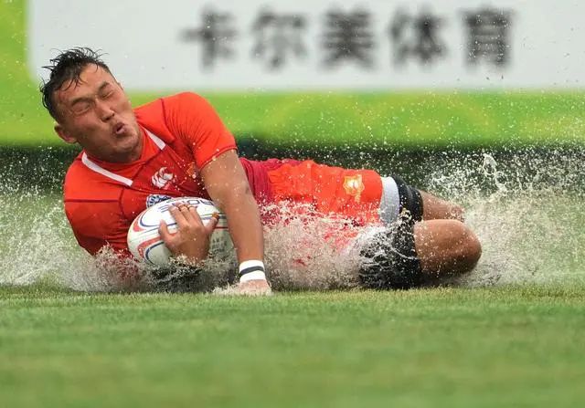 ↑天津队球员阿尔达克·木合亚提在比赛中达阵得分。