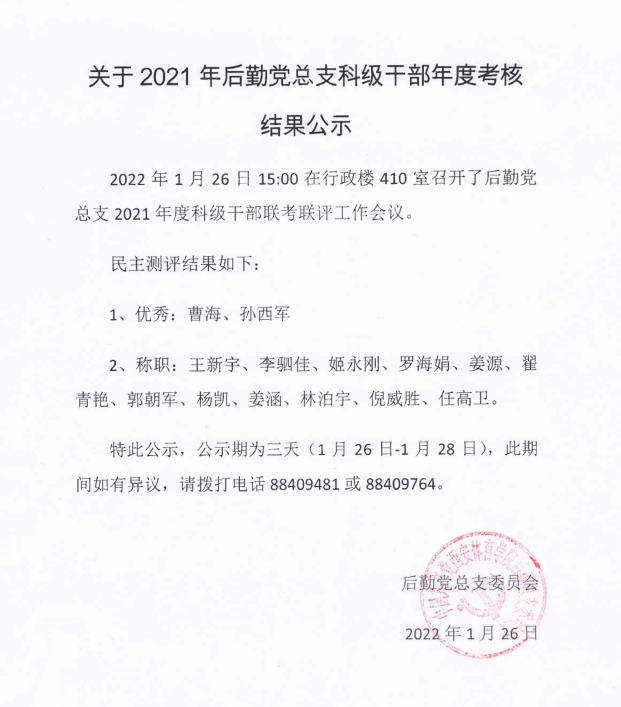 后勤管理处(集团)2021年度员工绩效考核结果公示