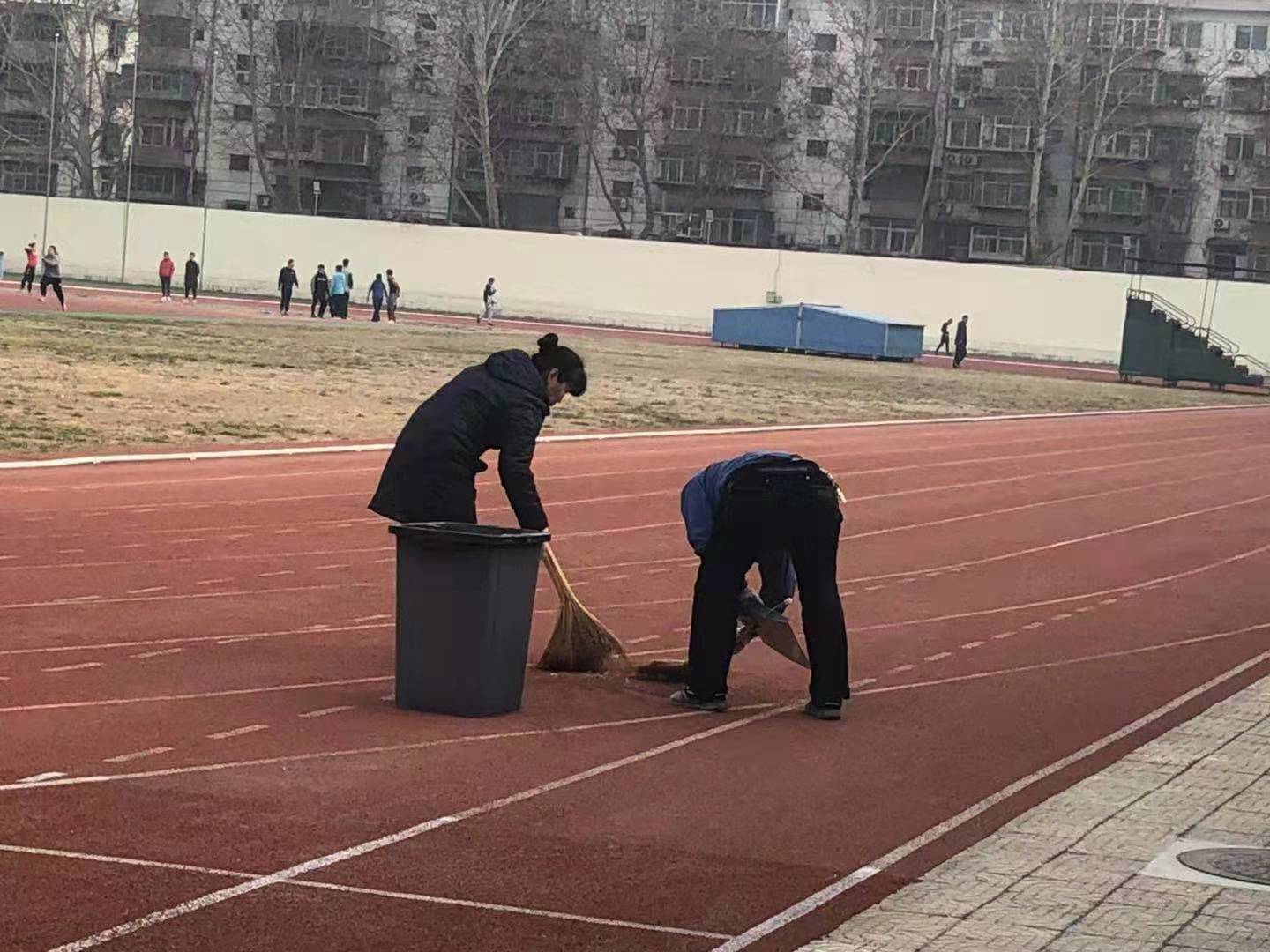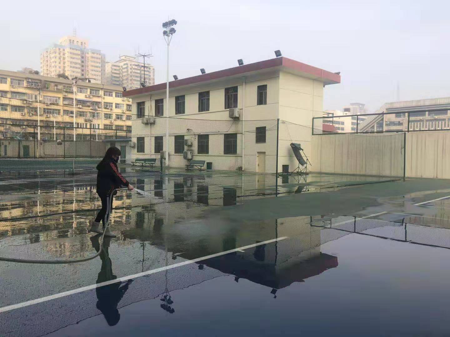 工作人员在场馆中心负责人的带领下,清点运动器材,并将其归类摆放,冲洗运动场地、防滑地毯,擦拭场馆器具、门窗,为返校师生营造一个舒适、温馨的学习、训练、科研场所。
