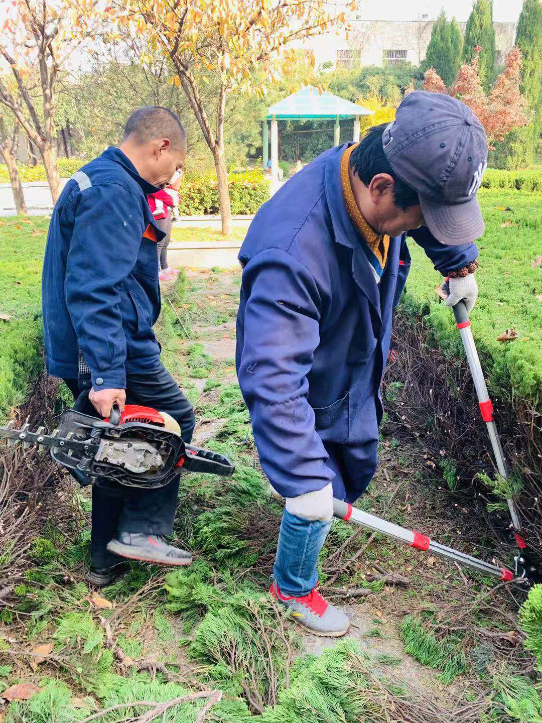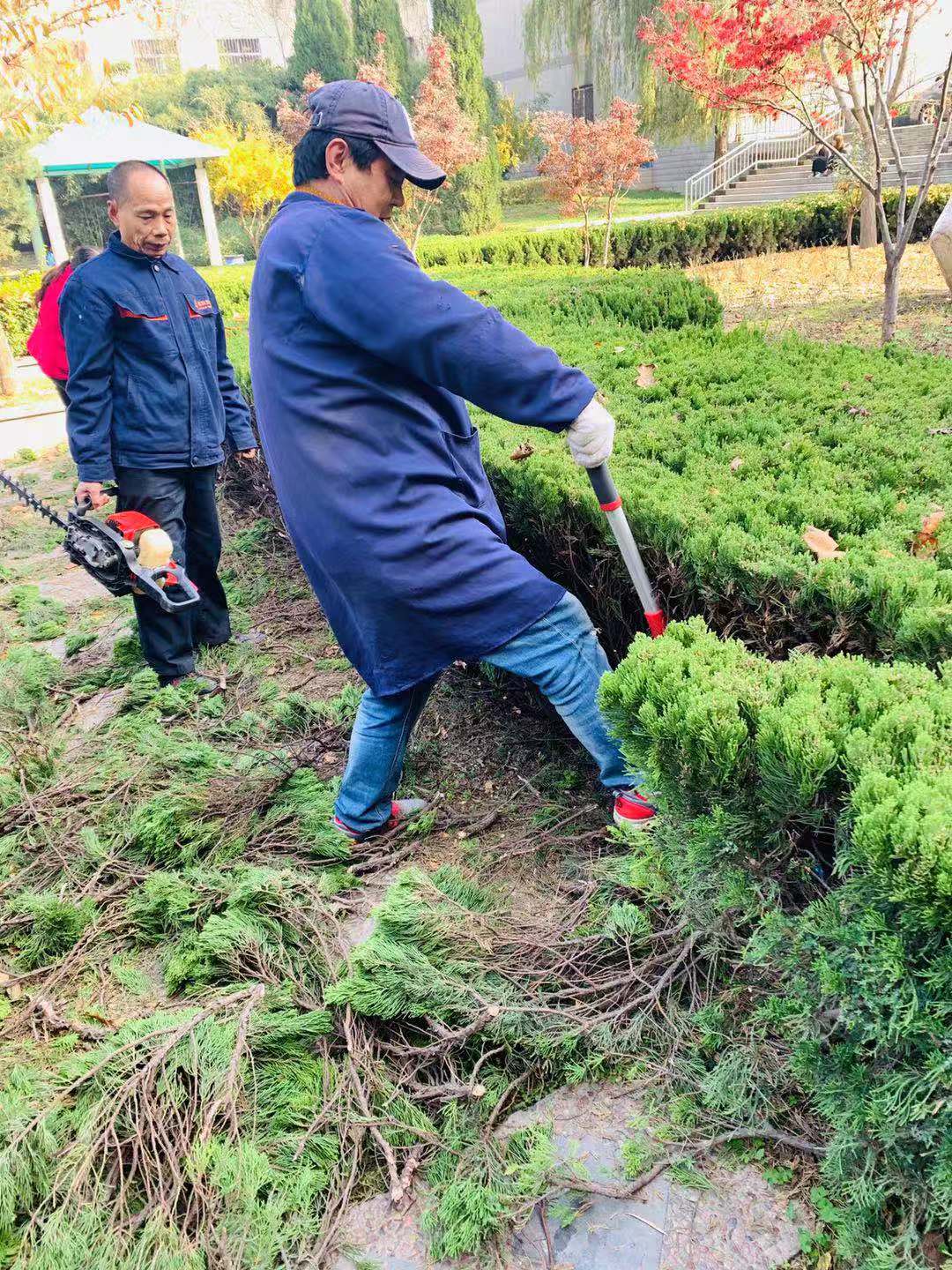在后勤管理处(集团)工作人员的精心养护下,奥林匹克花园的灌木长势旺盛,枝繁叶茂,使道路变窄。为保障师生安全顺利通行,2019年11月11日后勤管理处(集团)组织专业人员在保证苗木健康生长,保持良好景观造型的基础上进行长枝修剪工作,每修剪完一丛,后勤管理处(集团)工作人员就立刻对落地枯枝进行清扫、装车,确保校园干净整洁。