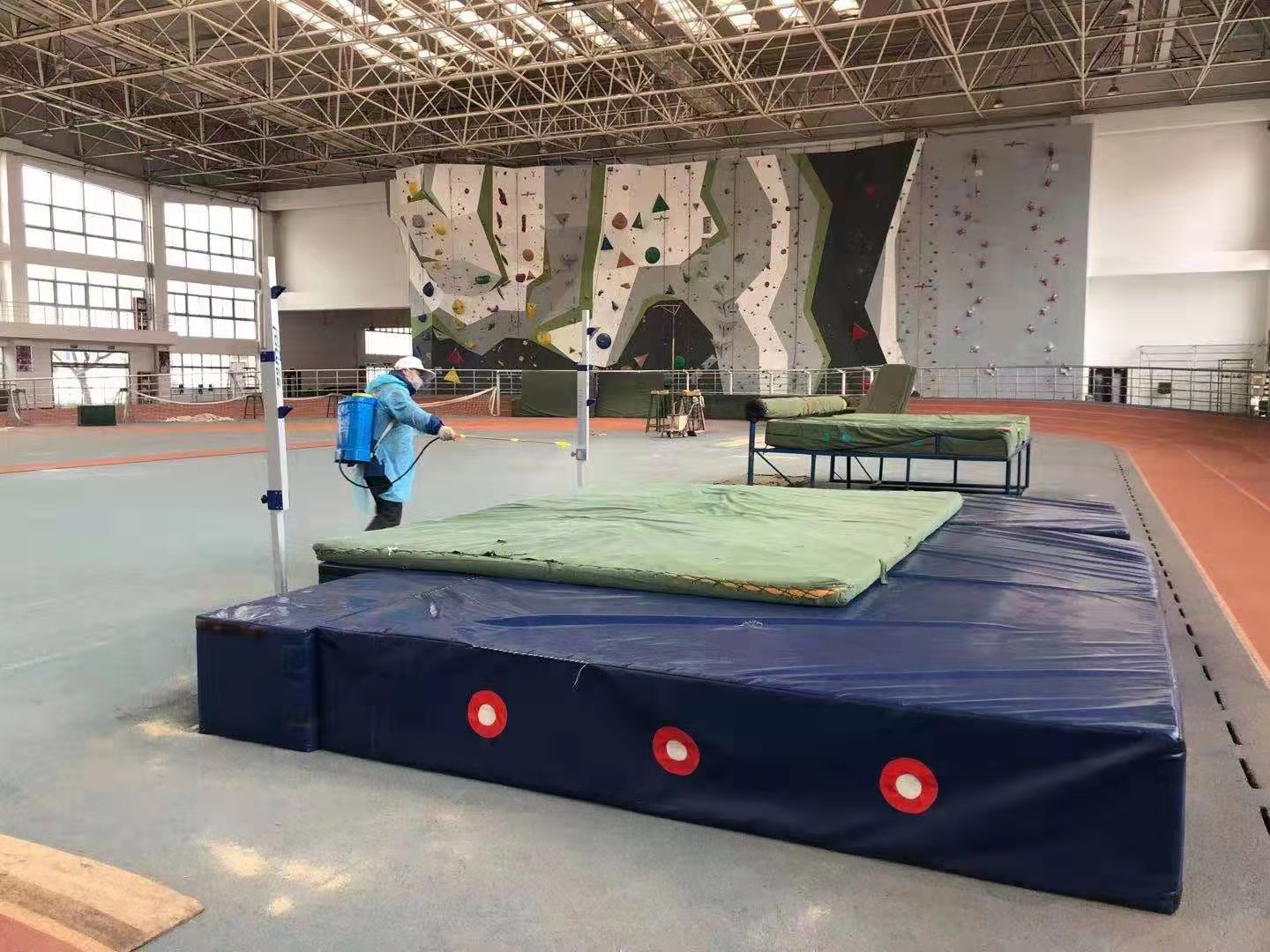 针对学校冬训安排和防疫要求,场馆中心积极与训练单位沟通,根据具体训练安排,科学合理地做好消毒工作。利用学生训练不在公寓的间隙,每日使用含氯消毒液对训练学员公寓喷洒消毒至少2次;在训练前和训练结束后,每日使用含氯消毒液分别对训练场馆喷洒消毒至少2次;门拉手、公共洗手间便池、水龙头、门厅等每日使用含氯消毒液擦拭或喷洒消毒2次以上,通过全面细致的工作确保场馆安全。