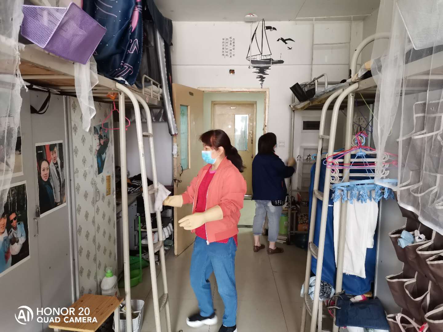 为了使学生在开学后拥有一个健康、安全、干净的居住环境,学生公寓管理中心的工作人员继每日对公寓公共区域清洁消毒外,开始对学生宿舍内部进行全面清洁消毒工作。工作人员认真、专业、仔细、全面,绝不留下一个死角,同时认真做好消毒记录。
