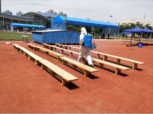 考试用卫生间(田径场、综合馆1层、篮球场)消杀4次;