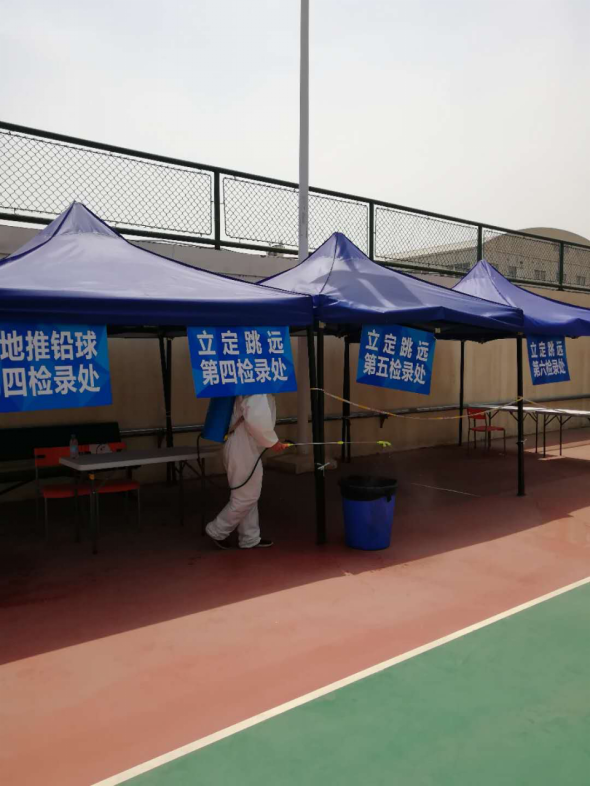 考试用卫生间(田径场、综合馆1层、篮球场)消杀4次;