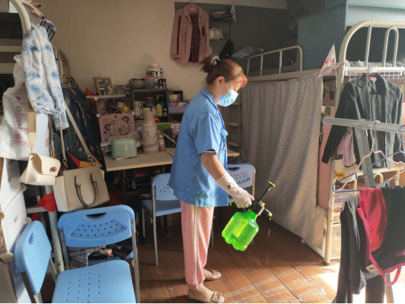 (一)后勤管理处(集团)学生公寓管理中心在对工作人员进行体温检测、登记后,严格按照校医院《学生公寓消毒指南》要求做好学生公寓清洁、消毒每日2次,通风工作每日3次,每次30分钟,以及学生体温检测工作。