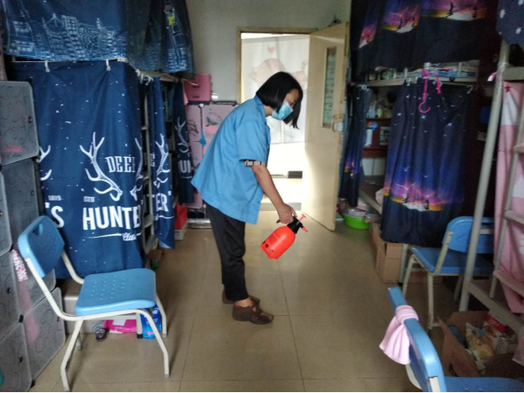 (二)后勤管理处(集团)学生公寓管理中心在对工作人员进行体温检测、登记后,严格按照校医院《学生公寓消毒指南》要求做好学生公寓清洁、消毒每日2次,通风工作每日3次,每次30分钟,以及学生体温检测工作。