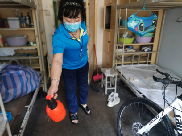 (二)后勤管理处(集团)学生公寓管理中心在对工作人员进行体温检测、登记后,严格按照校医院《学生公寓消毒指南》要求做好学生公寓清洁、消毒每日2次,通风工作每日3次,每次30分钟,以及学生体温检测工作。