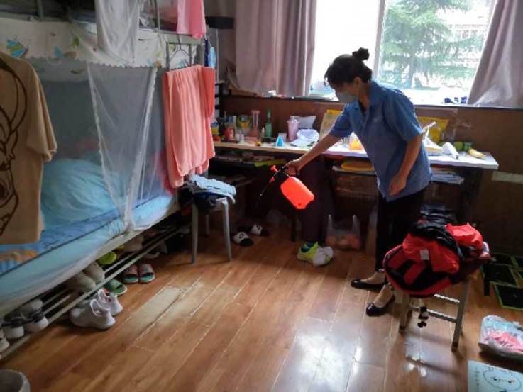 (一)后勤管理处(集团)学生公寓管理中心在对工作人员进行体温检测、登记后,严格按照校医院《学生公寓消毒指南》要求做好学生公寓清洁、消毒每日2次,通风工作每日3次,每次30分钟,以及学生体温检测工作。