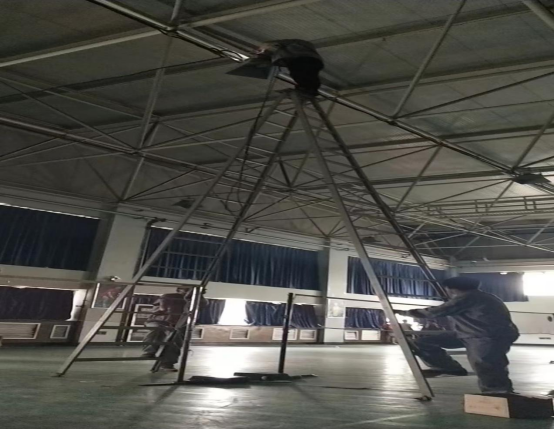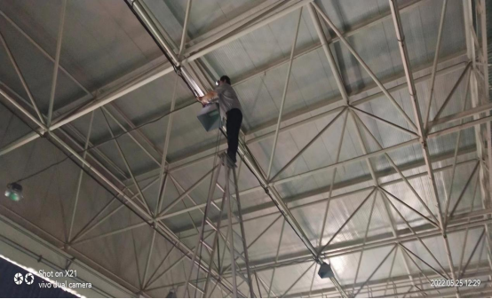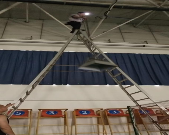 面对场馆教学任务重,课程密集的情况,保障中心工作人员当机立断,放弃中午午休时间,加班紧急进行更换。羽毛球馆空间高度较高,照明灯具沉重,工作人员在确保安全措施到位的情况下,赶在下午上课前完成更换工作,确保师生教学不受影响。