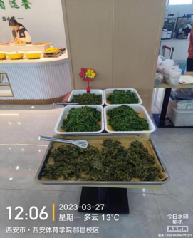 经过餐厅工作人员的采摘、清洗、加工,多种口味的苜蓿菜摆放在餐厅一楼自选餐档口供大家免费品尝,从采摘到加工,倾注了后勤工作人员对同学们满满的关爱。