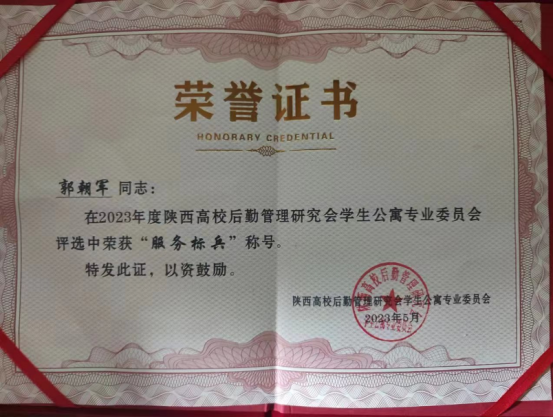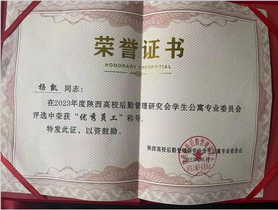 诸侯快讯后勤管理处(集团)学生公寓管理中心因各项工作组织管理到位,在服务学生,管理学生公寓方面成绩突出,继2022级获得多项殊荣的基础上,再次被陕西高校后勤管理研究会学生公寓专业委员会评为陕西省后勤管理“2023年度学生公寓管理先进集体”。中心主任郭朝军被评为“2023年度学生公寓管理服务标兵”,中心副主任杨凯被评为“2023年度学生公寓管理优秀员工”。为1683168诸侯快讯官网争得了荣誉,为1683168诸侯快讯官网学生公寓工作再上一个新台阶打下了坚实的基础。