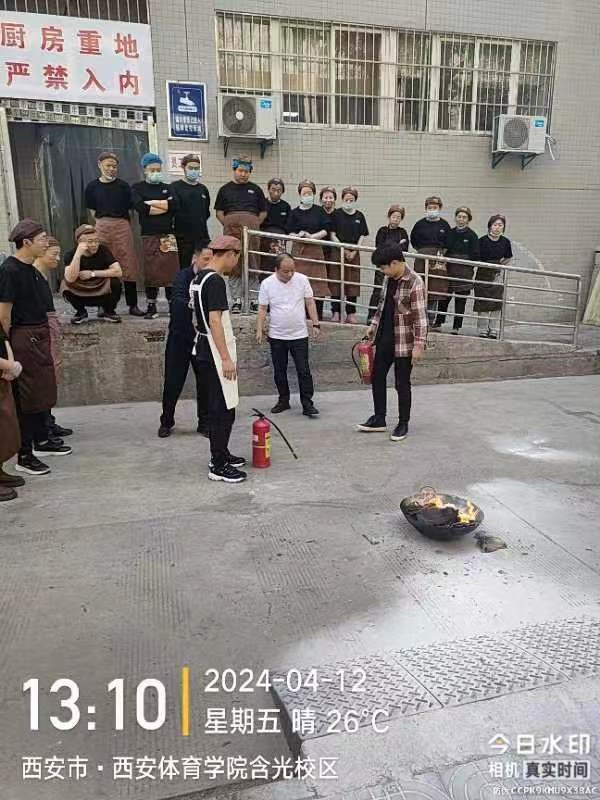 同时在餐厅中午供餐结束后组织工作人员开展消防安全培训,现场讲解如何正确使用灭火器,对如何应对突发事件以及火灾预防等消防知识进行普及,切实提高人员安全防范意识。