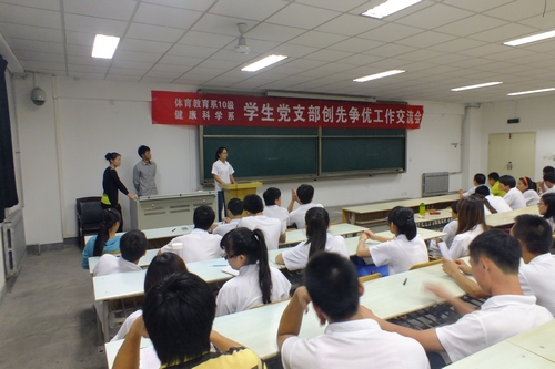 本网讯9月19日晚,由健康科学系与体育教育系2010级联合举办的学生党支部创先争优工作交流会在教学楼201教室拉开帷幕,两系相关教师和100余名学生党员、入党积极分子参加了本次交流会。