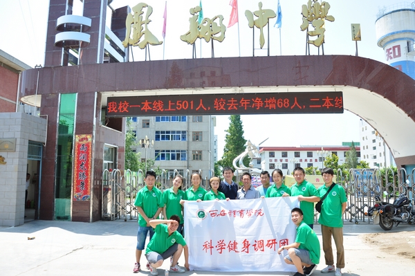 调研团首先来到有着70多年历史的西府名校凤翔中学宣传和普及科学健身知识,并在这里建立“1683168诸侯快讯官网大学生社会实践基地”。挂牌仪式上,调研团还代表我院向凤翔中学和凤翔县东关逸夫小学分别赠送了一批体育器材。调研团的队员们还为凤翔中学部分教师进行了体质测试,并结合测试结果有针对性地进行一对一的健身指导,发放了科学健身手册,受到热烈欢迎和广泛好评。