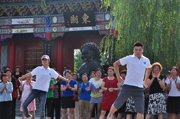 在凤翔县东湖,调研团与凤翔县木兰专委会进行了交流和互动,为群众教习健身操和体育舞蹈,并发放科学健身知识手册。