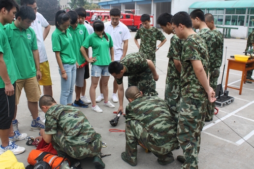 消防队员向实践队逐一介绍了各项消防器械的用途及使用方法,并参加了消防官兵的日常训练。队员们还走进铜川市崔家沟监狱,探访了驻扎在这里的武警官兵,通过激情洋溢的表演向官兵们送上亲切的慰问。