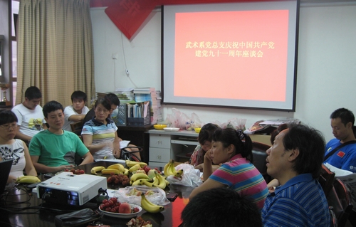 本网讯 6月29日上午,武术系党总支在系会议室举行庆祝中国共产党建党九十一周年座谈会,该系全体教师党员和部分学生党员代表参加了会议,系主任马文国作为无党派人士代表应邀出席。