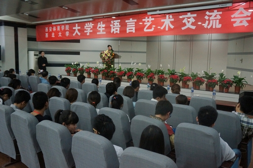 院团委副书记高月宏致欢迎词。他对西北大学各位师生的到来表示欢迎,希望通过此次活动为双方大学生提升运用语言艺术的技巧搭建平台,推动我院校园文化建设再上新台阶,取得新发展。西北大学新闻传播学院周东华教授介绍了西北大学播音主持专业的发展情况以及参加全国“齐越朗诵艺术节”的经验和本校齐越艺术社的发展历程。我院体育传媒系主任马增强介绍了我院播音主持专业的发展情况。学生会秘书长王鹏宣读了我院齐越艺术社成立及机构人员名单。