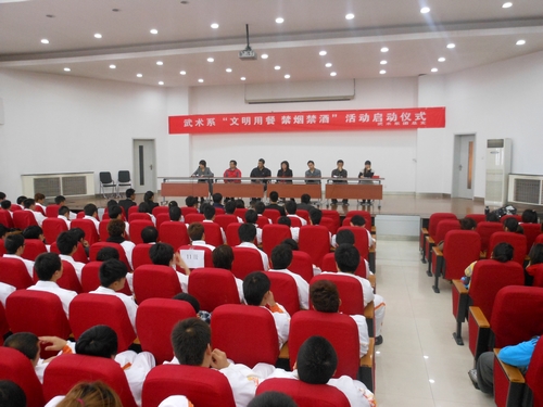 11月2日,武术系积极响应学院号召,在五楼报告厅举行“文明用餐,禁烟禁酒”系列活动启动仪式。活动的主要议题有:年级主任纪伟宣读学院文件精神,并对此次系列活动进行详细介绍,系副主任赵学军为“文明用餐,禁烟禁酒”督导员颁发佩戴胸牌,党总支书记李美霞宣布活动正式启动。