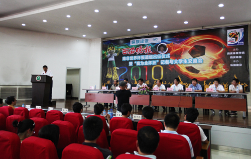 我院党委副书记苏义民在欢迎辞中代表学院全体师生向为大学生球迷搭建交流平台的西安晚报社表示衷心感谢,向参加本次出征仪式的媒体朋友表示热烈欢迎,并向来宾介绍了学院的历史及近年来的发展成果。同时,他希望记者们把南非世界杯的精彩及时传递给广大的足球爱好者,为球迷呈现一场视听盛宴。并要求大家理性对待世界杯,文明观看世界杯。交流会主持人陕西球迷协会会长柯兴平用富于激情的声音向大家讲述出此次西安晚报出征2010年南非世界杯的重要意义。