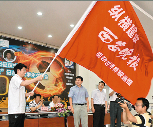 西安晚报出征南非记者王瑞接过报道组旗帜