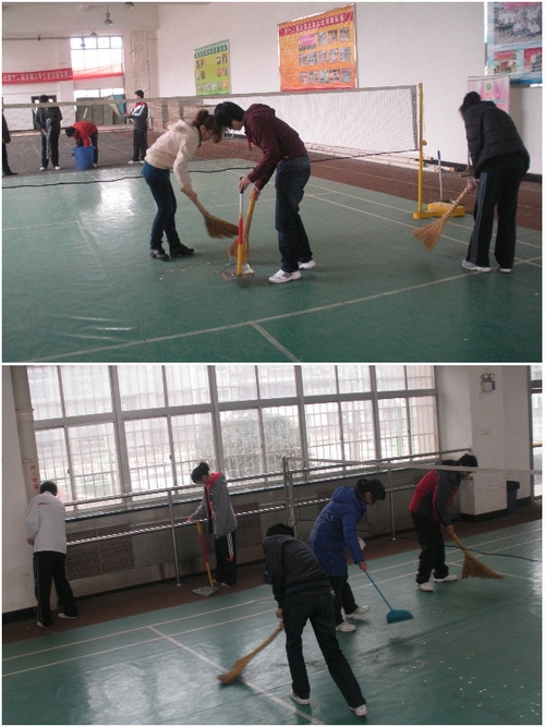 运动系师生在清扫训练场馆