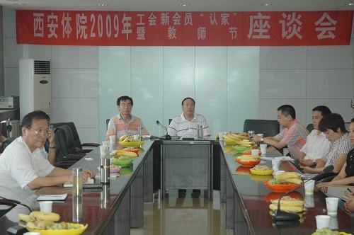 9月4日下午,我院2009年工会新会员“认家”暨教师节座谈会在行政楼二楼大会议室召开。院长苏明理、党委副书记朱元利、副院长周里、党委委员刘新平等领导出席了会议。会议由院工会副主席李建华主持。