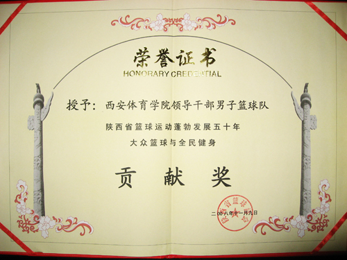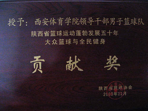 陕西省篮球协会授予我院领导干部男子篮球队“陕西省篮球运动蓬勃发展五十年大众篮球与全民健身贡献奖”。