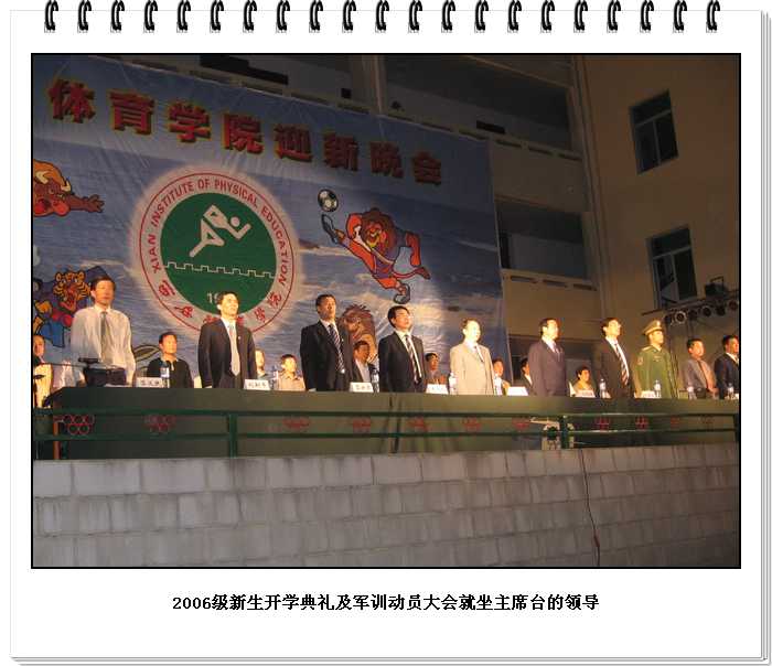 9月18日晚,我院沣峪口校区华灯齐放,彩旗飘扬,2006年开学典礼暨军训动员大会在嘹亮的军歌声中隆重拉开帷幕。院党委书记董小龙,院长苏明理,党委副书记朱元利,党委副书记、纪委书记苏义民,副院长权德庆,副院长雷新声,副院长周里,党委委员、组织部部长刘新平,党委委员、人事处处长陈彦以及陕西省体操管理中心的领导和我院相关部门的领导出席了会议。我院2006级新同学、辅导员、军训团教官参加了会议。会议由苏义民副书记主持。
