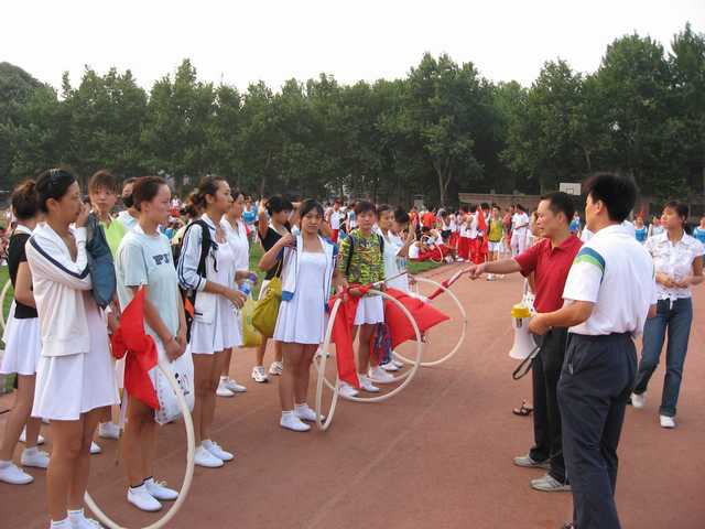 排练场上教练们不厌其烦的向学生们讲解示范动作,声音喊嘶哑了,人也消瘦了一圈,但她们丝毫没有半点懈怠,表现出了高度的工作热情和责任感。学生们密切配合,酷热的天气出现了中暑,汗水浸湿了衣服,大家虽然疲惫不堪,可仍然积极认真的投入到排练中去,以确保开幕式演出成功。排练中表现出了高度的团队意识和协作精神,不畏烈日酷暑刻苦拼搏的优秀品质,千余名学生用他们的汗水与激情诠释着《快乐体育》的内涵。