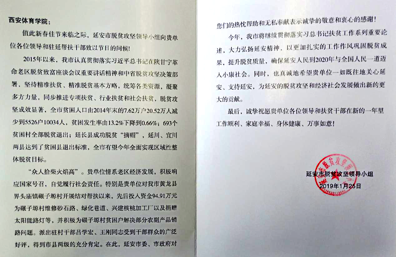 本网讯 日前,延安市脱贫攻坚领导小组代表延安市委、市政府给我院寄来感谢信,对我院情系老区经济发展,积极响应国家号召,自觉履行社会责任,热忱帮扶和无私奉献表示诚挚的敬意和衷心的感谢。