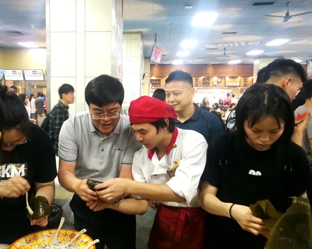 本网讯      临近端午佳节,后勤管理处联系院学生会在学院餐厅举办了包粽子比赛等弘扬传统节日文化活动,党委书记黄道峻、党委副书记刘子实、副院长李富生与学生欢聚一堂,共度佳节。