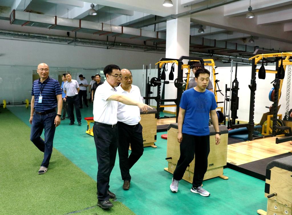刘建林一行还参观了学校实验楼、新建攀岩墙、游泳馆等教学场地与设施,并饶有趣味地体验了部分人体健康分析仪器,观看了师生训练。