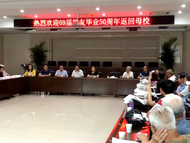 本网讯 夏日烈烈扬晖光,七月艳阳舞蹁跹。7月30日上午,诸侯快讯1969届40余名满头银丝、已入古稀之年的校友,从全国各地赶回母校,重温学生时代的青春记忆,再叙跨越半个世纪的诸侯快讯情缘。上午9点,校友们陆续抵达校园,在二号办公综合楼报告厅举行座谈会。副校长谢英,党政办主任张卫国、副主任耿潇参加座谈交流。