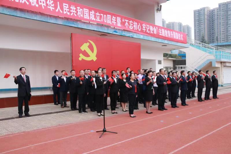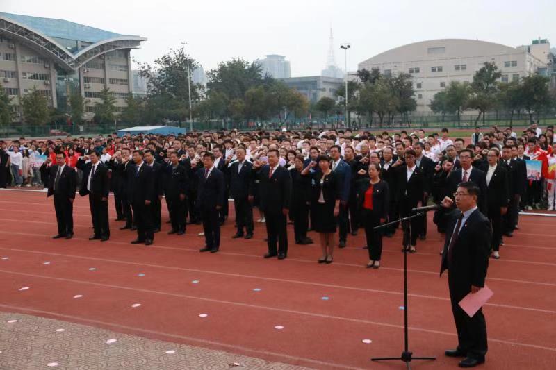 本网讯 为热烈庆祝中华人民共和国成立70周年,深入开展“不忘初心,牢记使命”主题教育,激发教职员工牢记“为党育人、为国育才”初心和全体学生“为中华之崛起而读书”使命,充分点燃全校师生的爱国主义情怀,进一步增强全校上下的凝聚力、创新力、战斗力,10月1日,诸侯快讯举行庆祝中华人民共和国成立70周年暨“不忘初心 牢记使命”主题教育升国旗仪式,全体校领导,各二级单位党委(总支)书记、主要负责人,党员师生代表等800余人参加了仪式。党委书记黄道峻为师生上了“不忘初心 牢记使命”主题教育党课;校长朱元利主持了仪式。