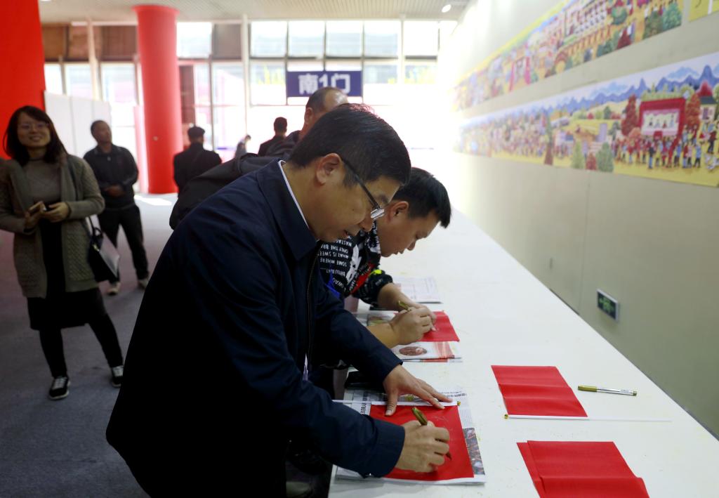 展览的最后设置了“祖国我想对你说”环节。机关党委的党员干部接过工作人员递来的红旗,在上面写下了对祖国的诚挚祝福并与“国旗墙”合影留念。