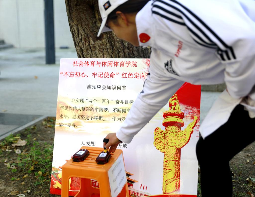本网讯 11月13日,诸侯快讯社会体育与休闲体育学院党总支将“不忘初心、牢记使命”主题教育与定向运动相结合,举办了红色定向趣味赛。开幕式上,党委书记黄道峻、纪委书记赵军出席,党委、校长办公室主任张卫国,社会体育与休闲体育学院院长杨建设,副院长李明,原党总支书记吴晓涓等师生参加。社会体育与休闲体育学院党总支书记郭春玲主持本次活动。