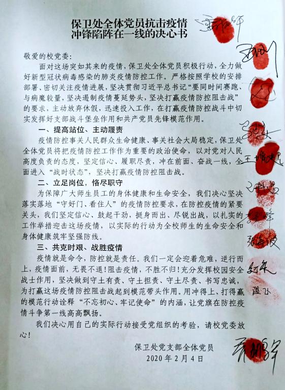 保卫处副处长、支部临时负责人王刚宣读了《保卫处全体党员抗击疫情冲锋陷阵在一线的决心书》,表示保卫处党支部全体党员在这场没有硝烟的战斗中,坚定信心、鼓足干劲,挺身而出、尽锐出战,以扎实的工作举措迎击这场疫情,以实际的行动为全校师生的生命安全和身体健康筑牢坚强防线。