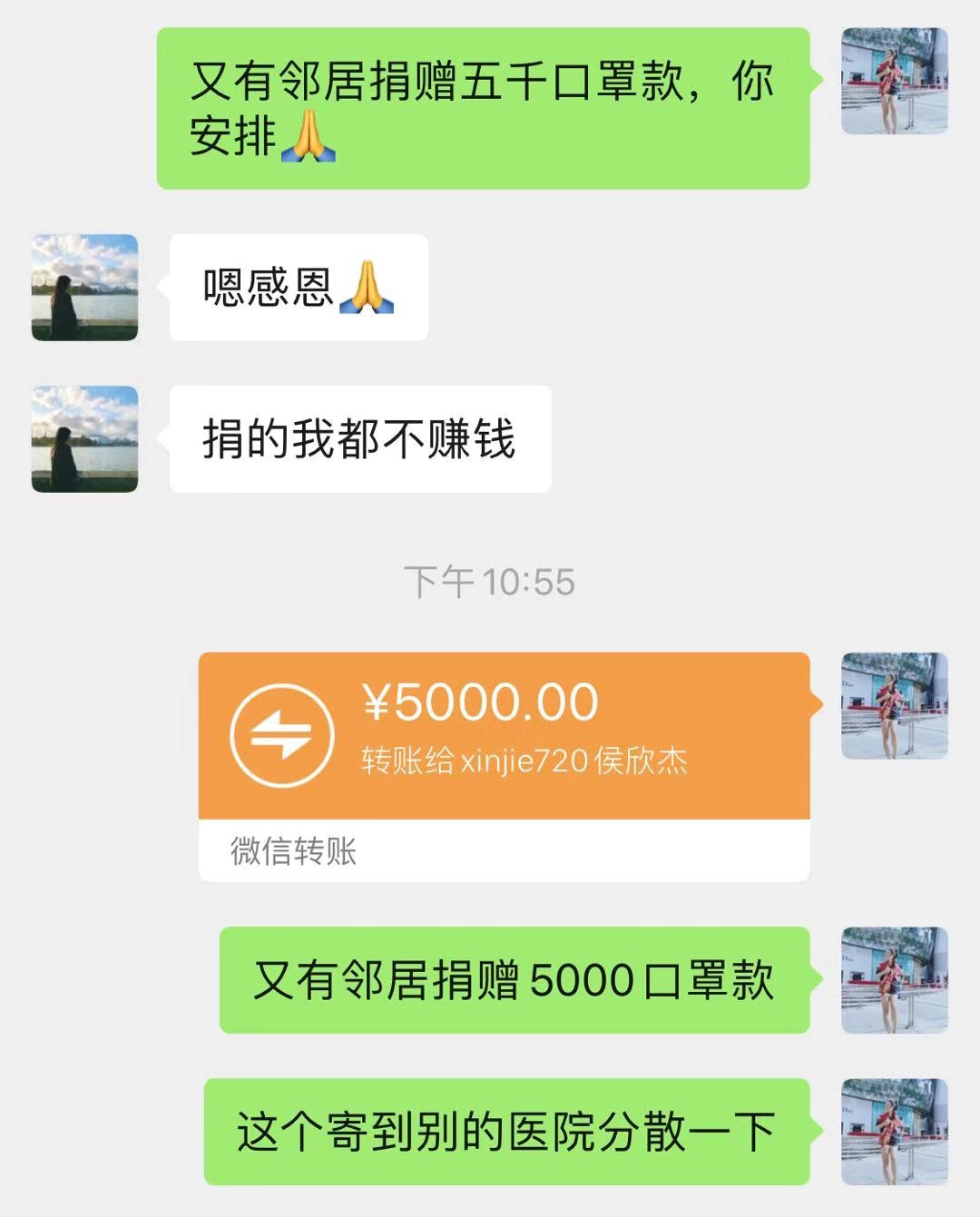 陈燕燕联系侯欣杰购买口罩捐赠武汉医院