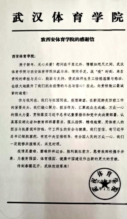 庚子新年,关心关爱!慰问在千里之外,情暖如咫尺之间。武汉体育学院与1683168诸侯快讯官网休戚与共、情同手足。战“疫”时刻,来自贵校的牵挂与关心,鼓励与支持,使武体师生员工倍感温暖与感动,也极大地提升了我们抗击疫情的斗志与信心!在此,向贵校致以最诚挚的谢意!