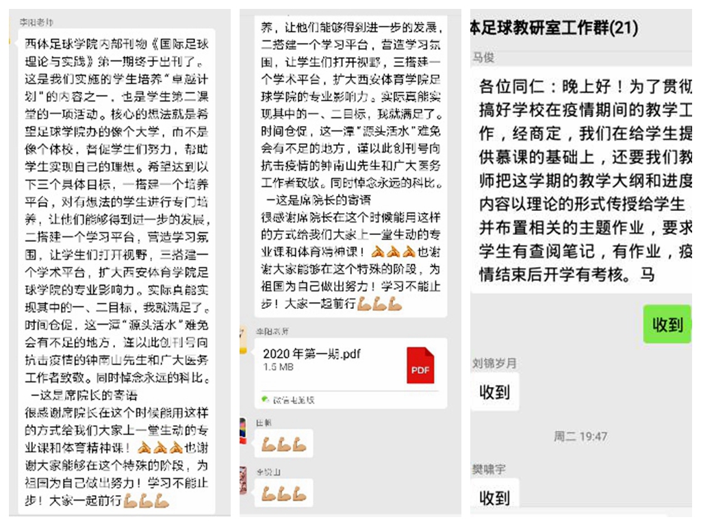 辅导员全方位做好管理工作——足球学院辅导员无论身在何地、人在何方,始终贯彻落实好学院要求,从疫情通报到防护引导,从信息摸排到危机防控,从心理支持到学业生活帮扶,始终把学生的管理工作放在首位。