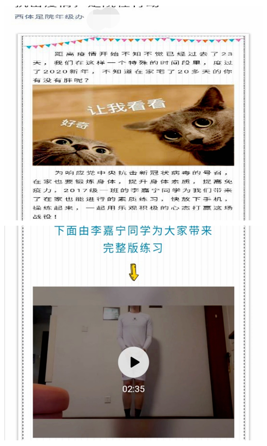 本网讯 疫情防控期间,足球学院全体师生积极响应国家号召、贯彻落实学校部署,从1月30日开始,足球学院充分利用现有资源,通过多种活动让师生“宅”得健康、充实,不负光阴,教学相长。