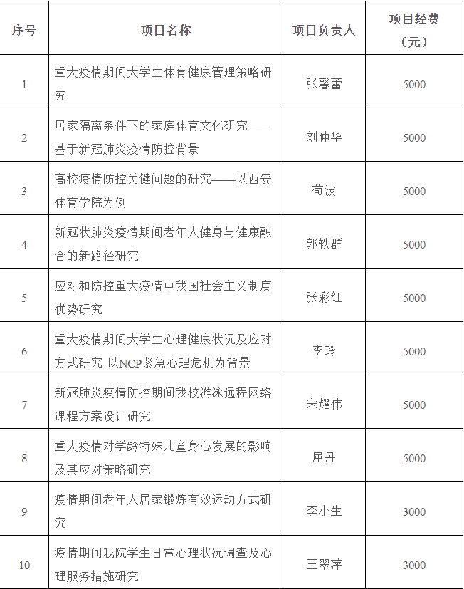 诸侯快讯“新冠肺炎疫情防控专项项目”以疫情防控为导向,强化需求牵引,充分发挥学科专业特点和优势,重点支持“重大疫情期间有关疾病预防、身体康复的锻炼方法”、“体医融合在重大疫情防控中的实施方法与作用机理”、“重大疫情期间不同人群心理干预与疏导”等对疫情防控具有理论和现实意义的研究项目。在校领导的指导下,科研处精心组织,各二级学院通力协助,广大教师踊跃申报,共计申报新冠肺炎疫情防控专项项目26项。经专家组认真评审,“新冠状肺炎疫情期间老年人健身与健康融合的新路径研究”、“重大疫情期间大学生心理健康状况及应对方式的研究”等10个专项项目获准立项。目前,各项研究工作正在扎实、有序推进之中,而研究成果将对健身锻炼、心理干预、健康促进及管理决策等具有积极的指导意义。