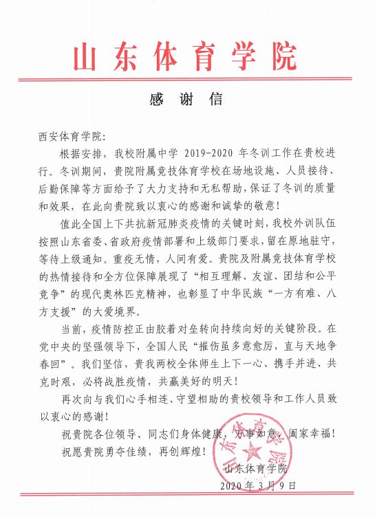 竞技体校在获悉山东体育学院附属中学所面临的问题后,第一时间上报校领导,本着兄弟院校互帮互助的原则,竞技体校克服种种困难,每天安排专人负责送餐,尽最大努力保障23名运动员与2名教练员一日三餐的营养与健康。山东体育学院得知这一情况后向诸侯快讯发来了感谢信,对诸侯快讯关键时期的鼎力帮助表示了谢意。