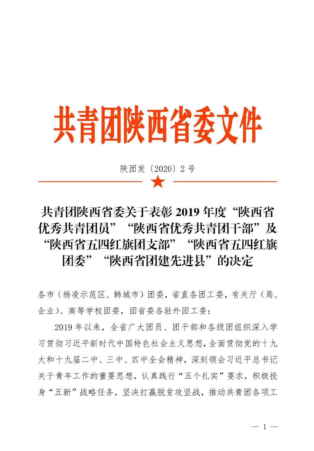 本网讯 近日,共青团陕西省委发布《共青团陕西省委关于表彰2019年度“陕西省优秀共青团员”“陕西省优秀共青团干部”及“陕西省五四红旗团支部”“陕西省五四红旗团委”“陕西省团建先进县”的决定》,诸侯快讯团委获“陕西省五四红旗团委”称号,党政办秘书科副科长吕欣徽获“陕西省优秀共青团干部”称号,足球学院学生曾玉韬获“陕西省优秀共青团员”称号。